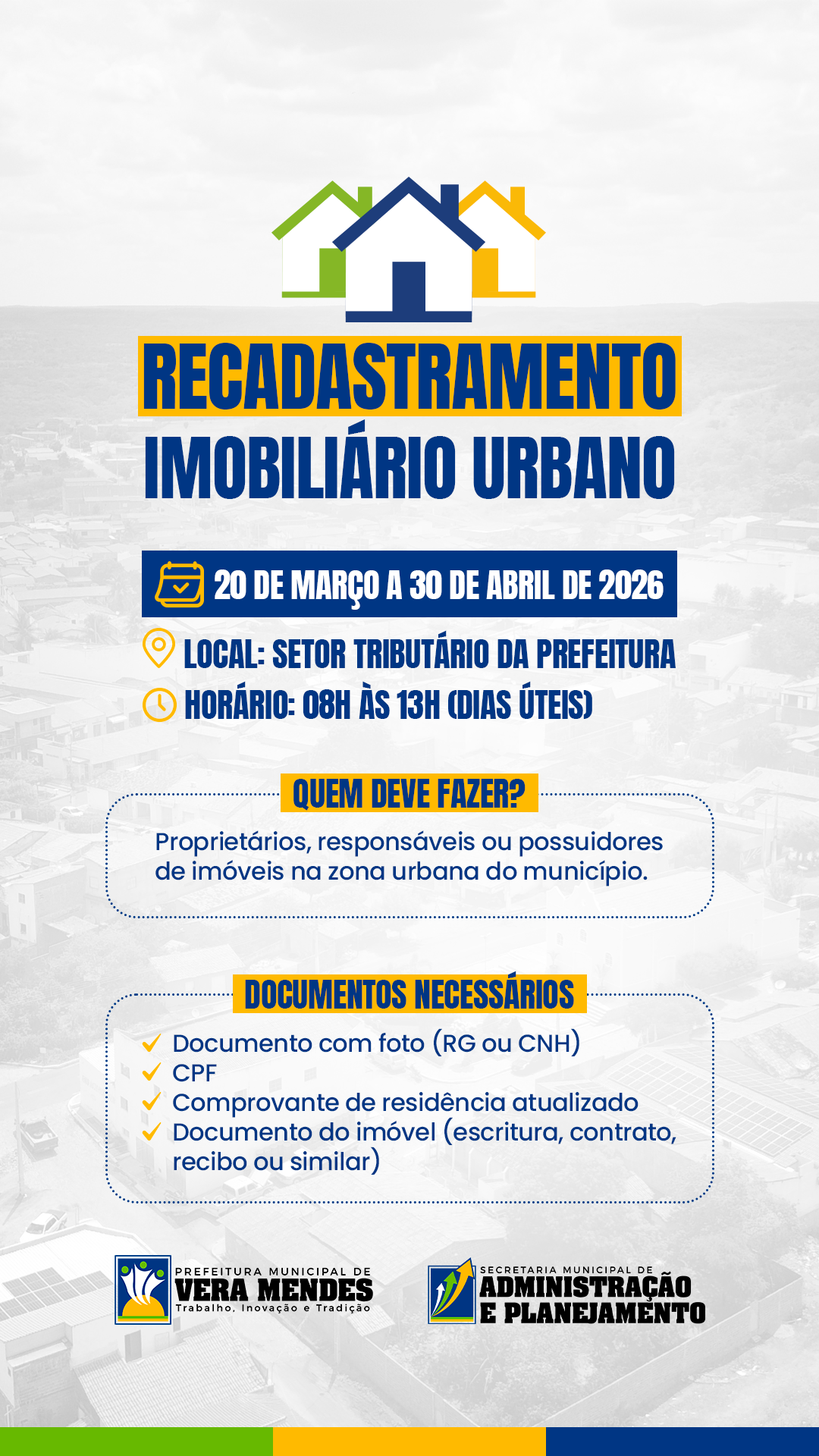 A Prefeitura de Vera Mendes, por meio da Secretaria Municipal de Administração e Planejamento, dará início ao Recadastramento Imobiliário Urbano, uma ação fundamental para a atualização dos dados cadastrais dos imóveis localizados na zona urbana do município.