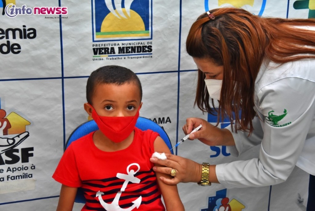 O município de Vera Mendes segue avançando na campanha de imunização contra a Covid-19, e na manhã desta quarta-feira, dia 26 de janeiro, a Prefeitura Municipal por meio da Secretaria de Saúde, deu início a campanha de vacinação de crianças com faixa etária entre 5 e 11 anos. A campanha de imunização, que foi realizada na UBS Carlos Hermógenes de Oliveira, é baseada nas orientações oficiais do Ministério da Saúde que incluíram as crianças no Plano Vacinal Brasileiro. Nesta primeira etapa, a vacina que está sendo aplicada é a CoronaVac. Na cidade, a primeira criança vacinada foi o Renan Silva, de 8 anos, que reside na zona rural do município na localidade Bom Lugar, e foi até o local, na sede, acompanhado da mãe, Francisca da Conceição. “Estou com um pouco de medo, mas é por um motivo bom, se livrar desse vírus e deixar de usar máscara.” Comentou Renan. Francisca, que já foi acometida pelo coronavírus, comemorou a vacina do filho. “É uma vitória, eu que já fui acometida pelo vírus, fico bastante feliz em ver todos ao meu redor já vacinados, viva a ciência, viva o sus e viva a saúde de Vera Mendes pelo belo trabalho.” Disse. De acordo com a secretária de Saúde, Andreia Sampaio, a previsão é que 250 crianças com essa faixa etária sejam vacinadas no município. “A vacinação segue por idade, de forma decrescente, conforme o recebimento de novas remessas de vacina, até que todo o público infantil seja vacinado.” Comentou. Andreia destacou ainda, que a campanha é importante e vacinar as crianças é prioridade. “A vacina tem se mostrado eficiente, pois tem evitado o agravamento da doença e reduzido o risco de morte.” disse a secretária de saúde. Para melhor receber as crianças, a equipe preparou uma logística especial com um local bem alegre e com decoração temática, e realizou também a entrega de mimos, como reconhecimento pelo gesto de bravura. Para ser atendida pela campanha de vacinação, a criança deve estar acompanhada por um dos pais ou outro responsável maior de 18 anos, com documento de identidade, sendo necessário apresentar três documentos: certidão de nascimento ou documento de identificação original com foto; cartão nacional do SUS ou CPF, e a caderneta de vacinação. A Secretaria de Saúde orienta ainda que para receber a vacina, a criança não pode ter recebido nenhuma outra vacina do calendário infantil nos 15 dias anteriores e que não esteja com qualquer doença na fase aguda (gripada, por exemplo). Fotos;