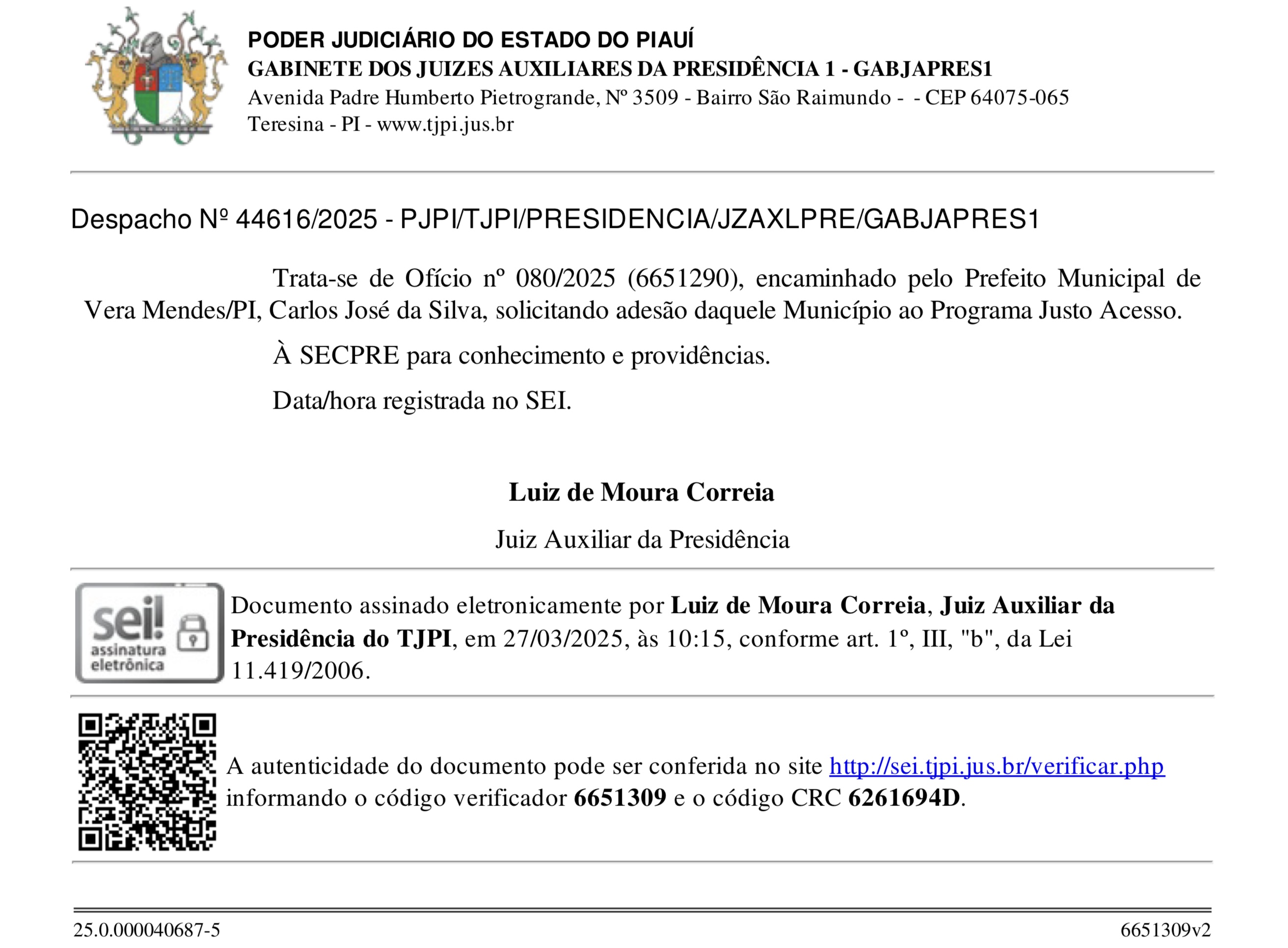 Tribunal de Justiça do Piauí acolhe solicitação do município de Vera Mendes para implantar o Programa Justo Acesso