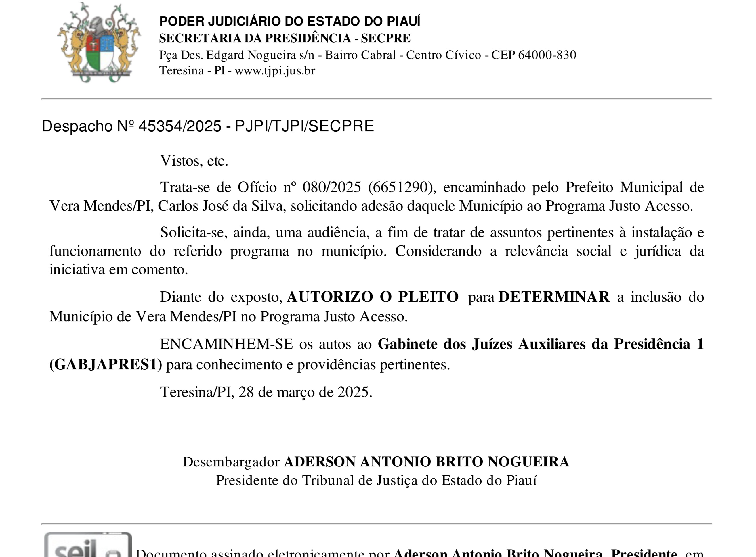 O município de Vera Mendes, no Piauí, acaba de garantir a adesão ao Programa Justo Acesso, uma iniciativa que visa ampliar a oferta de serviços jurídicos à população, promovendo mais justiça e cidadania. O pedido de adesão foi formalizado pelo prefeito Carlos José da Silva, por meio do Ofício nº 080/2025 (6651290), e autorizado pelas instâncias responsáveis.
